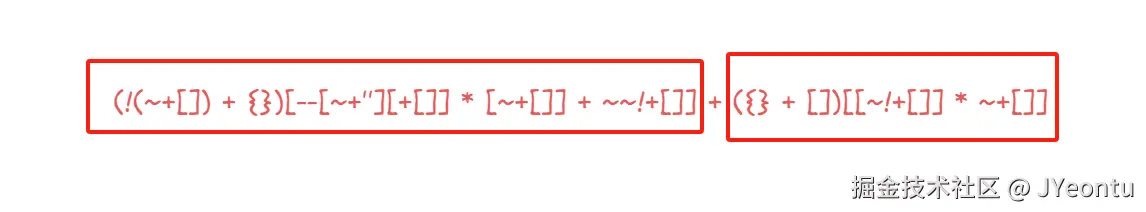 这段代码是一个典型的 JavaScript 混淆代码,通过一系列运算和隐式类型转换来生成字符串。首先我们先解析一下这段字符串,不难发现,这个字符串可以划分为两个部分: