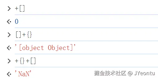 (+{}+[]) ,{}会被隐式转为数字类型,对象无法被解析成有效数字,所以会返回 NaN