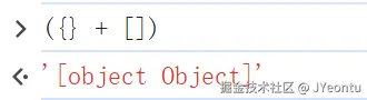 ({} + []) ,空对象转为字符串 "[object Object]",与空数组相加仍为 "[object Object]"。