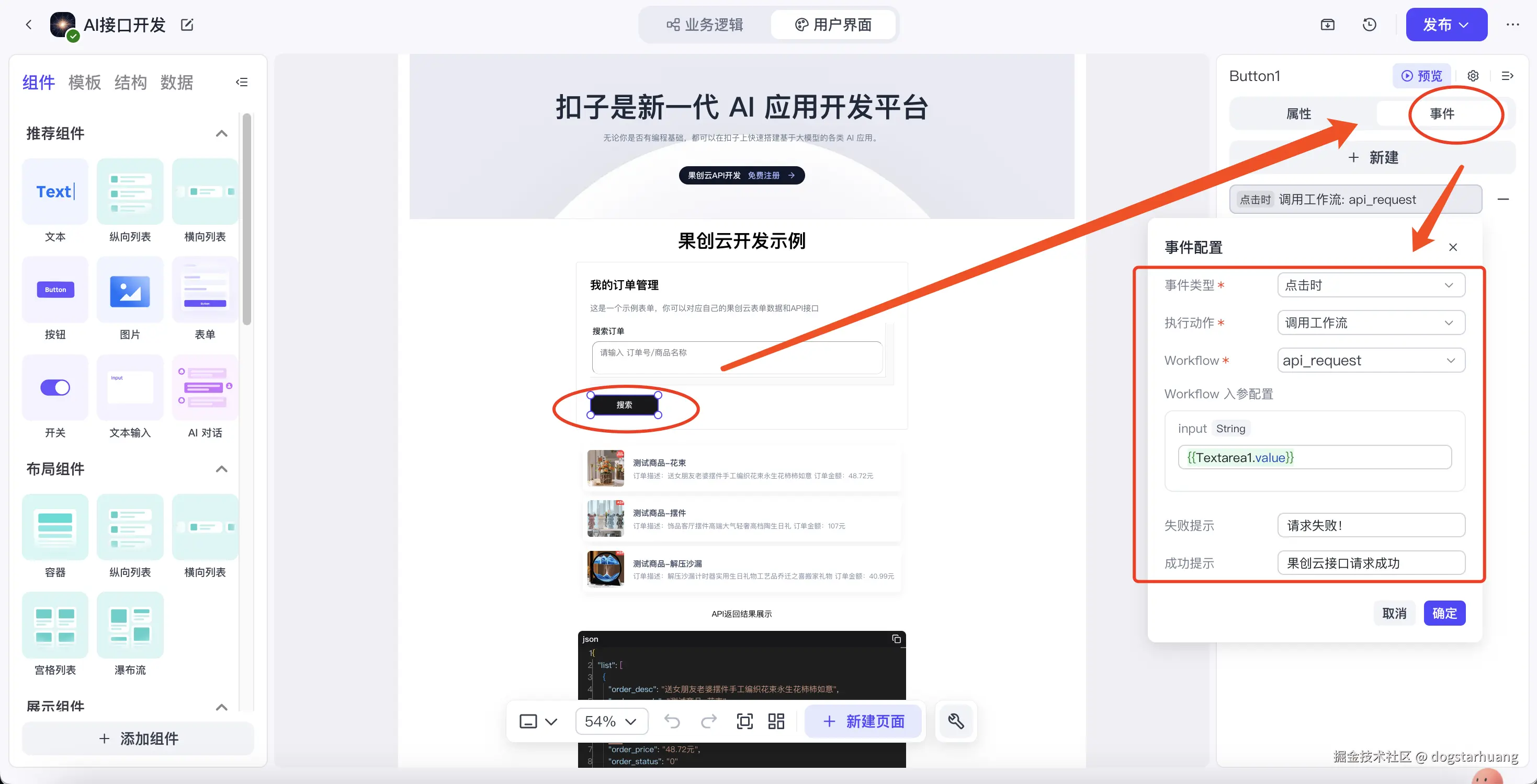 选中【搜索】按钮,切换到【事件】,【+新建】添加,设置事件类型为:点击时。依次设置前面的工作流,以及输入参数。