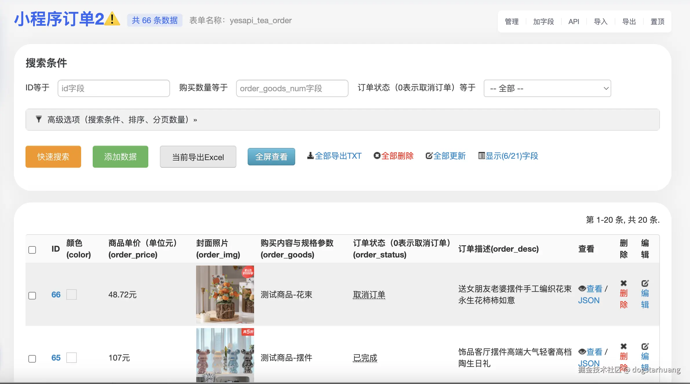 准备好表单数据后,再用果创云自带的API接口获取和查询列表数据。例如,我需要只返回3条数据、只返回我需要的字段、并且根据我的需要排序返回,还能支持订单搜索。
