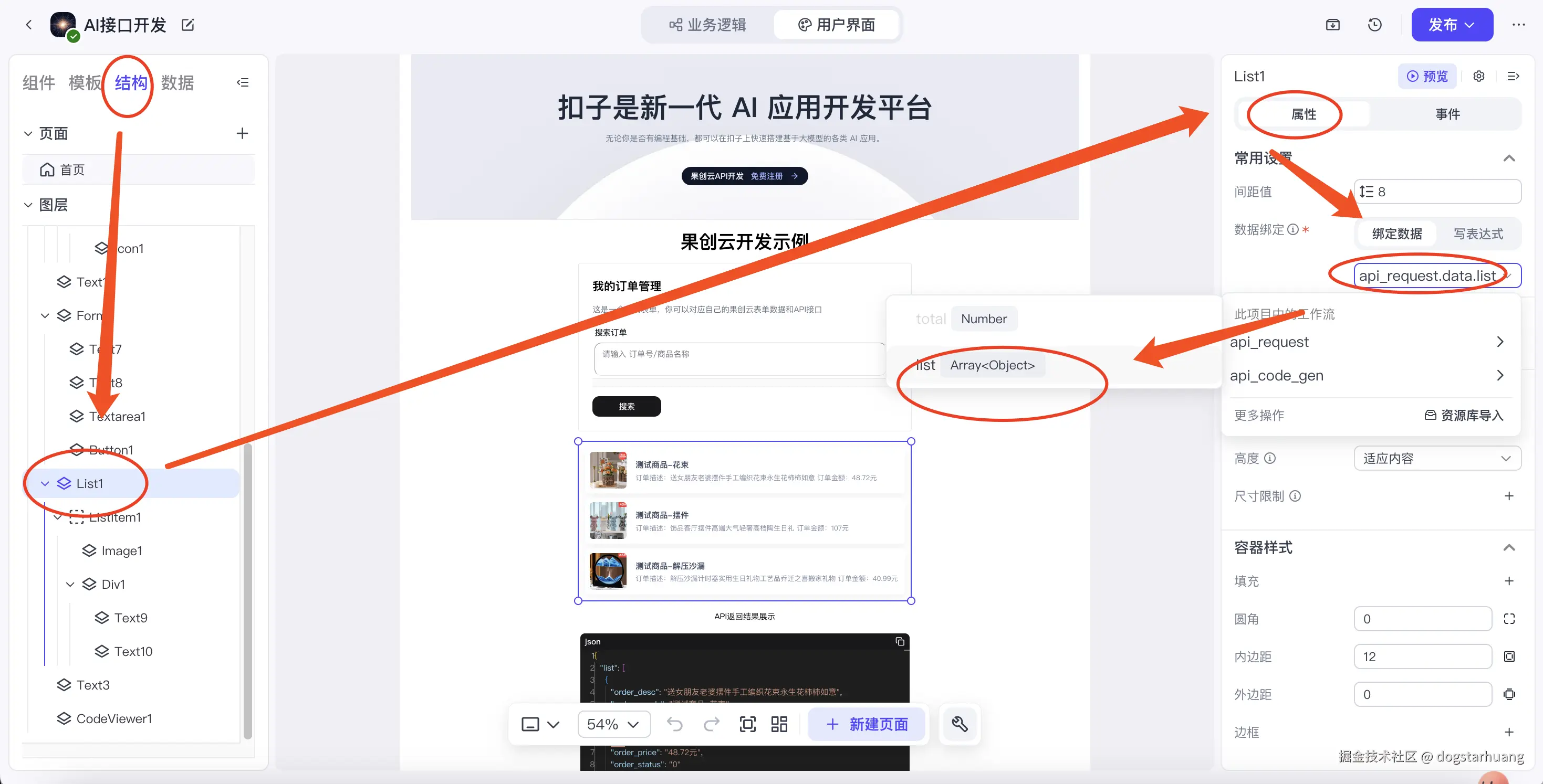 如果网站页面元素过多,你可以在【结构】通过层级来找到你的列表组件,在【属性】的数据绑定中,选中刚才工作流中返回结果的list字段。特别注意! 中间的data不要去掉!前面的工作流HTTP请求接口返回时一定要设置为【返回结果】而不是【返回文本】!