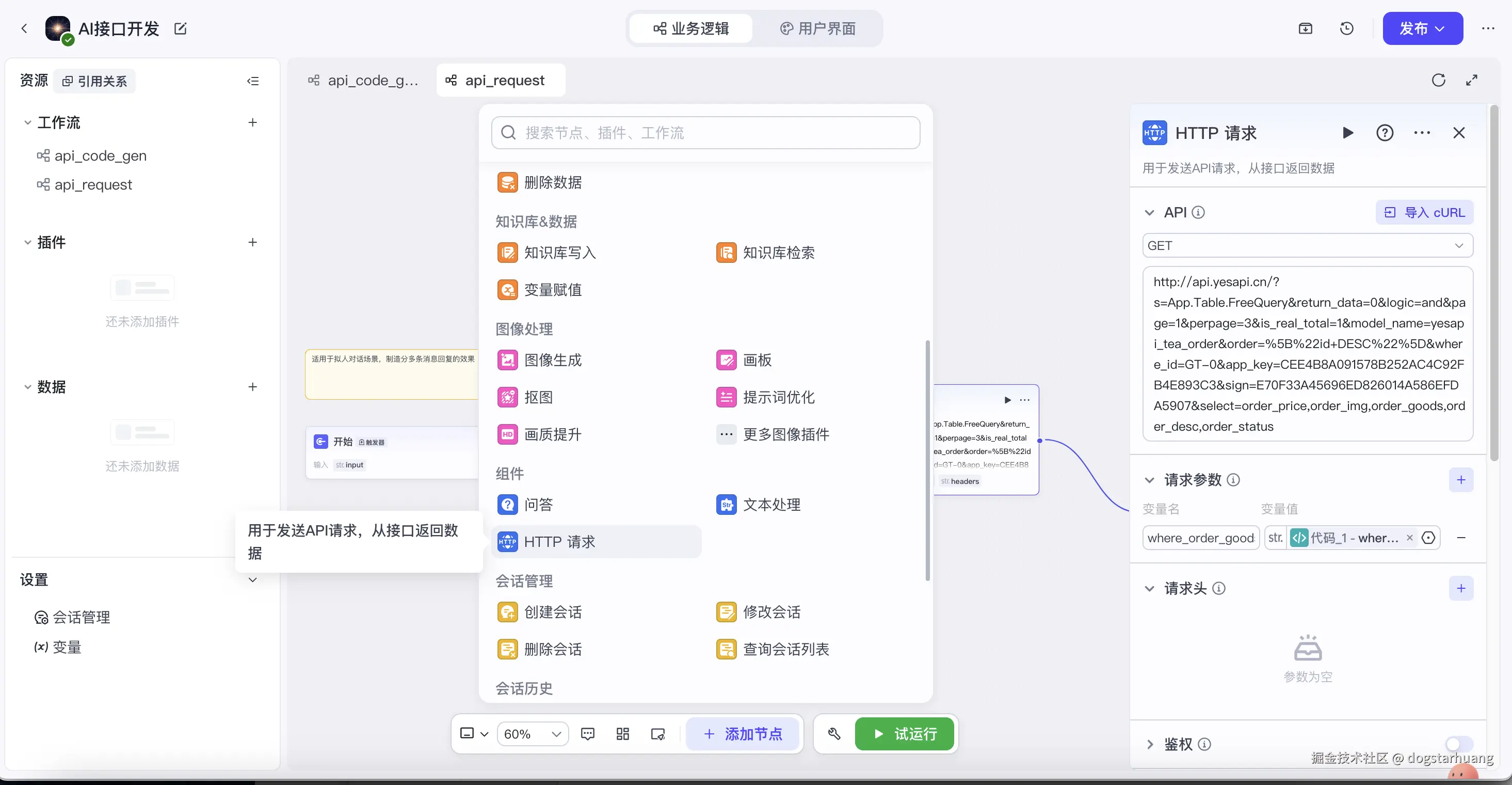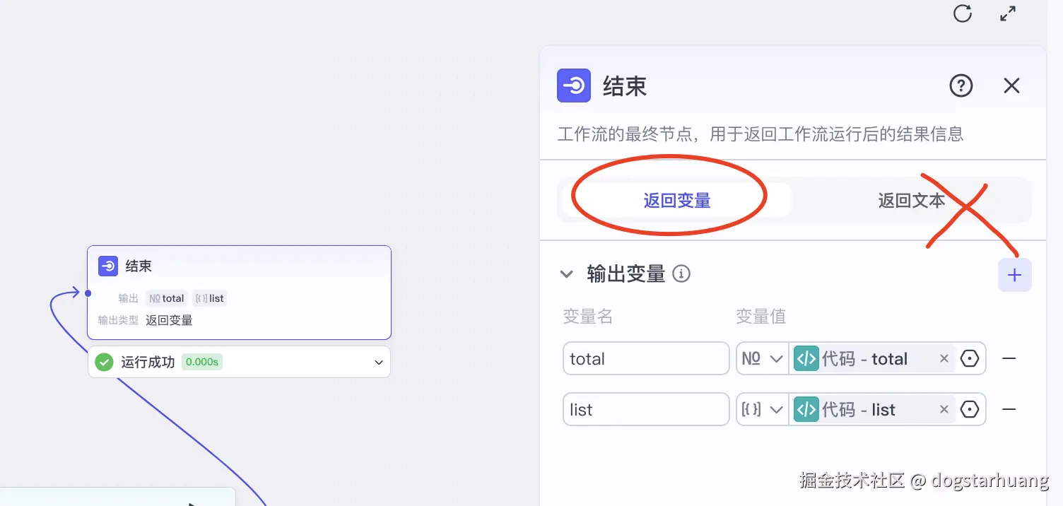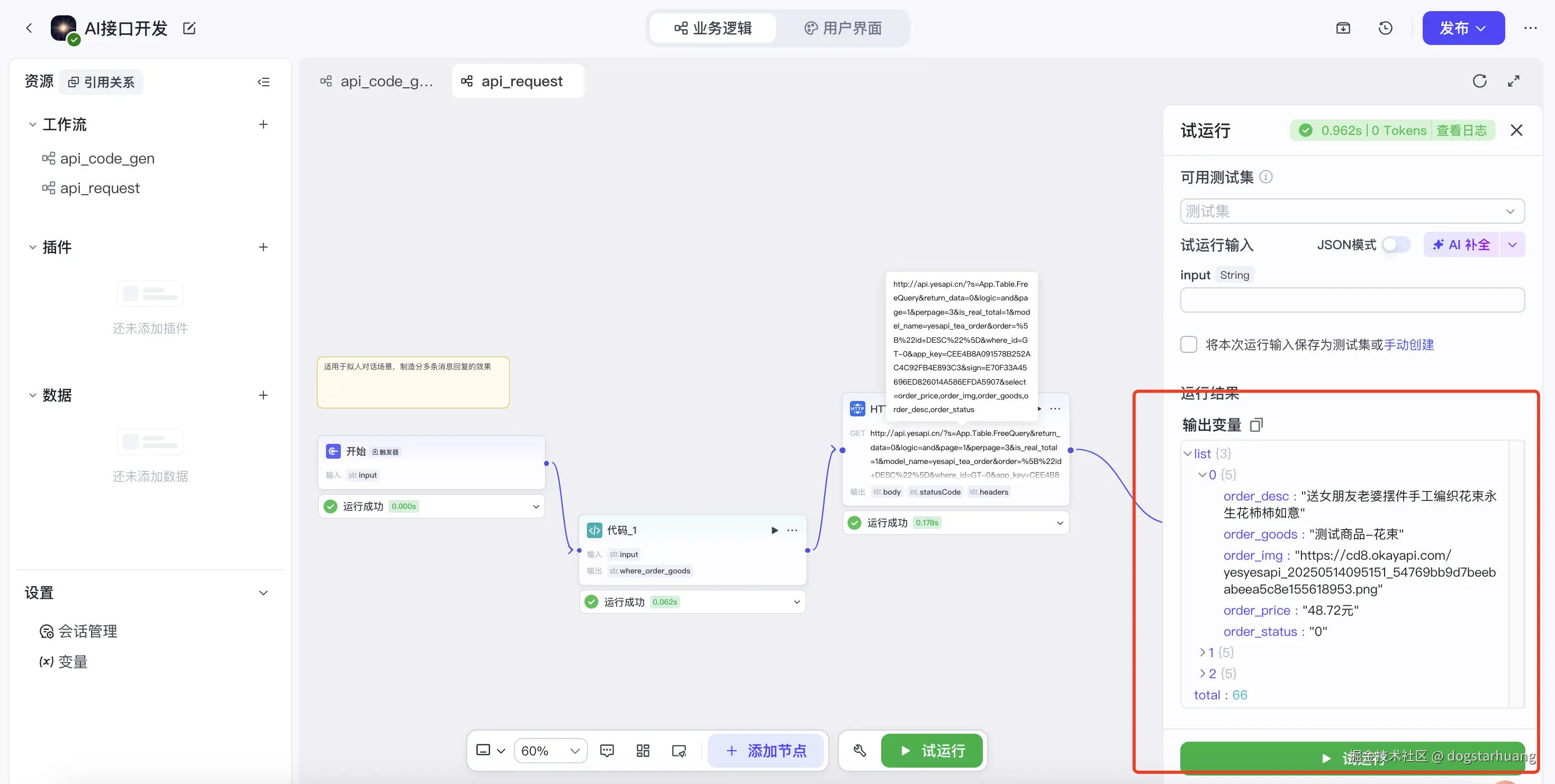 填写API接口请求地址、接口参数、JSON返回,以及对接口返回结果的代码处理,还有一定要注意在【结束】时的结果输出时选定【返回变量】,而不是【返回文本】。