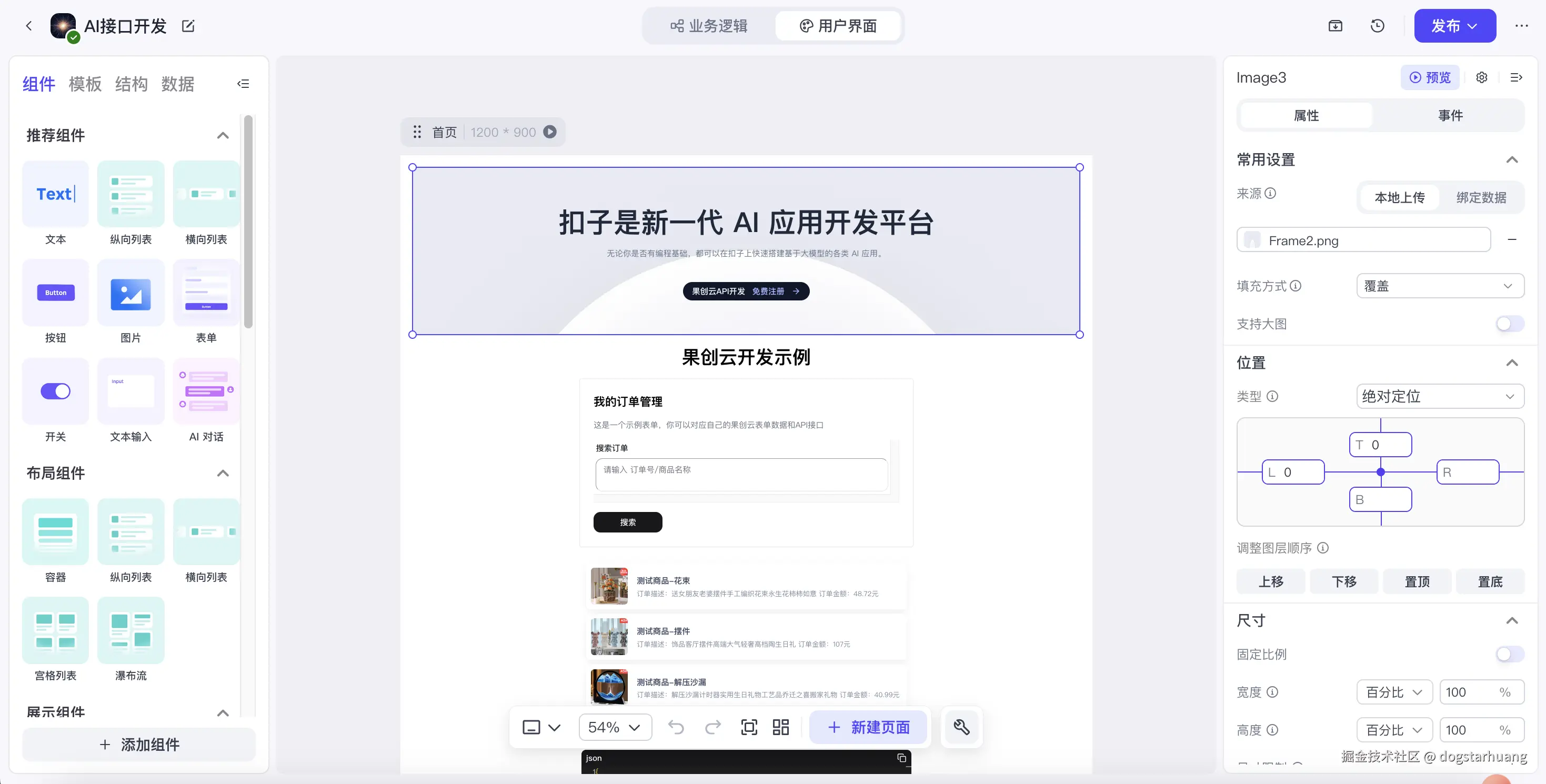 切换到【用户界面】,根据你自己的需要,可视化拖拉出你需要的网站界面。例如,我这里有:顶部的介绍、搜索表单、纵向列表(用来展示订单数据)、代码显示(用来显示接口请求结果,开发中)。