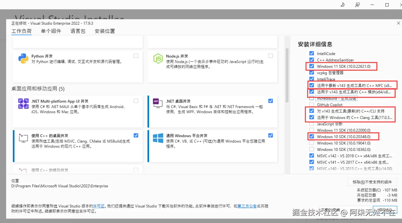 如果弹出错误提示需安装 Windows 10 SDK 版本 10.0.22621.0,请打开 SDK 管理器并勾选相应功能。