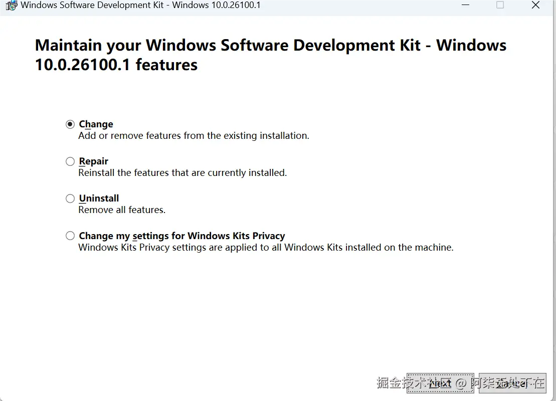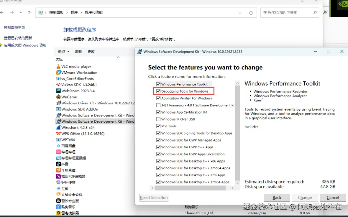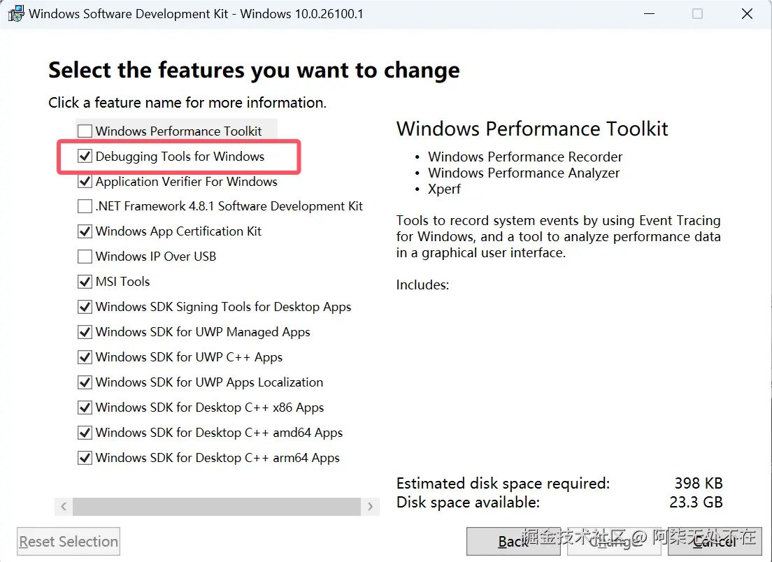 找到相应程序并点击修改,确保选择 "Debugging Tools for Windows" 特性。