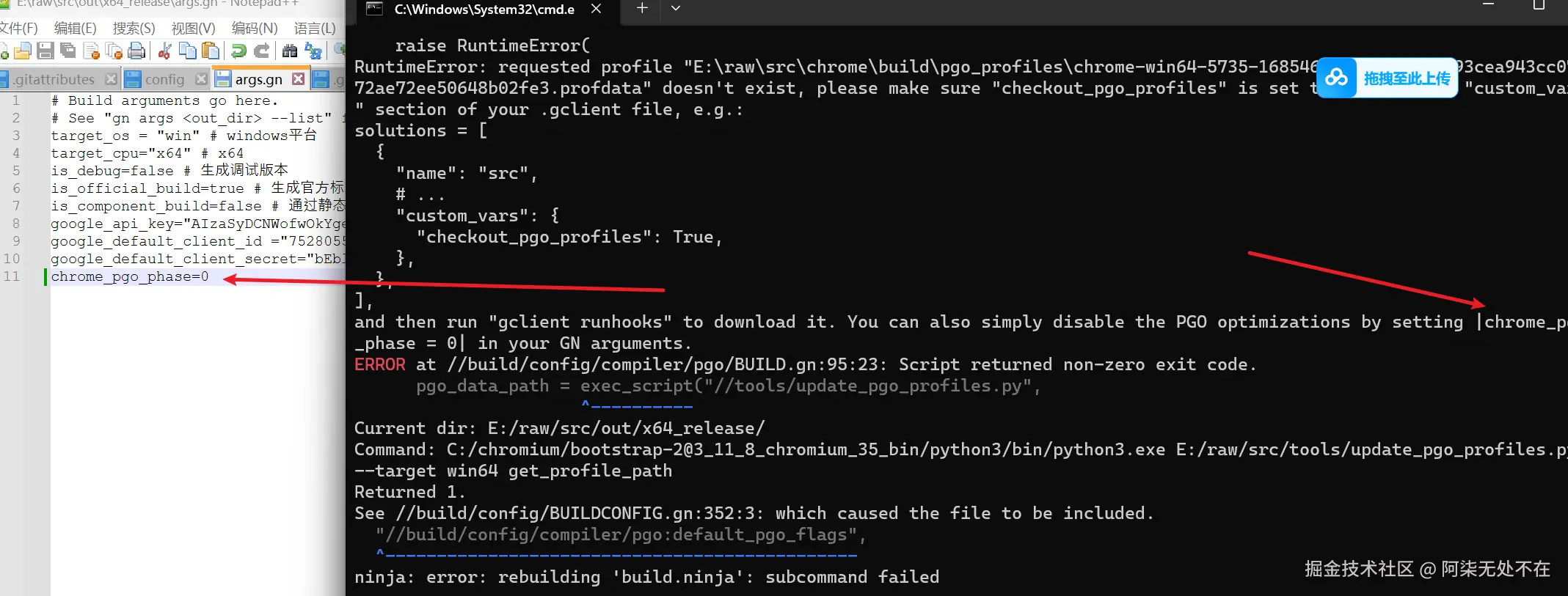 如果编译release版本时遇到PGO相关错误,则在src/out/*/args.gn加上chrome_pgo_phase=0,然后运行: