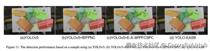 结果可视化显示:对于圆柱形药品云南白药,YOLOv5和YOLOv5+BIFPNC均因药品圆柱表面接近白色与背景色相似而干扰模型识别,导致漏检。yolov5+E-A-SPPFCSPC模型的分割结果如图11(c)所示,虽检测到云南白药,但对药品达喜的边缘分割不均。图11(d)表明YOLO-EASB模型能有效进行实例分割并清晰分割全部药品。通过可视化验证,YOLO-EASB模型对包含重叠和视觉相似药品的图像处理效果显著更优。