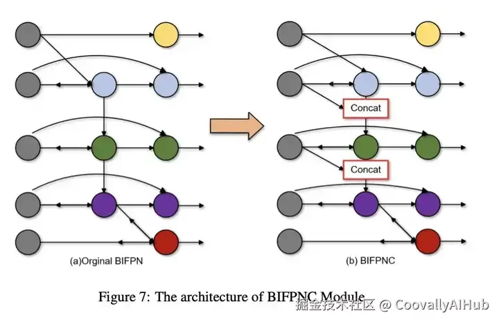 如图7(a)所示,原始BiFPN通过引入学习参数来表达各输入特征图的权重,使模型能学习训练过程中哪些特征层更重要,通过对权重归一化实现高效特征融合。但BiFPN在特征权重选择时倾向于上层特征,可能导致融合过程忽略浅层特征的重要信息,特别是对目标检测和分割至关重要的细粒度细节。