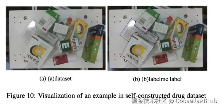 实际实验选取中国某药房的10种常见药品(如图9(a))评估模型性能,包括云南白药、创可贴、谷维素、铝碳酸镁咀嚼片、牛黄解毒颗粒、连花胶囊、银黄颗粒、阿莫西林、维生素E胶囊和塞来昔布胶囊。药品形态各异:多个长宽高不同的长方体,以及直径高度不同的圆柱体。拍摄地点为中国福建泉州(北纬24°52′32.0″,东经118°40′20.5″)。采用安装在实验药品分拣平台上的D435相机采集药品图像,初始图像尺寸为640像素×480像素,共采集600张图像构建数据集,图像格式为RGB。