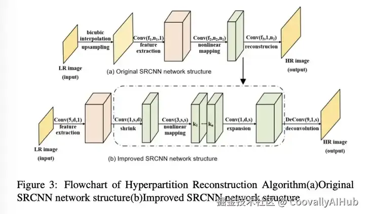 网络末端引入反卷积层进行上采样。此外,SRCNN 中的非线性映射层被收缩、映射和外扩散操作所取代,利用了更小的卷积核和更深的网络结构。与原始模型相比,这种方法收敛更有效,从而在保持较高重建质量的同时降低了误差。图 3(b) 所示为经过验证的算法流程。