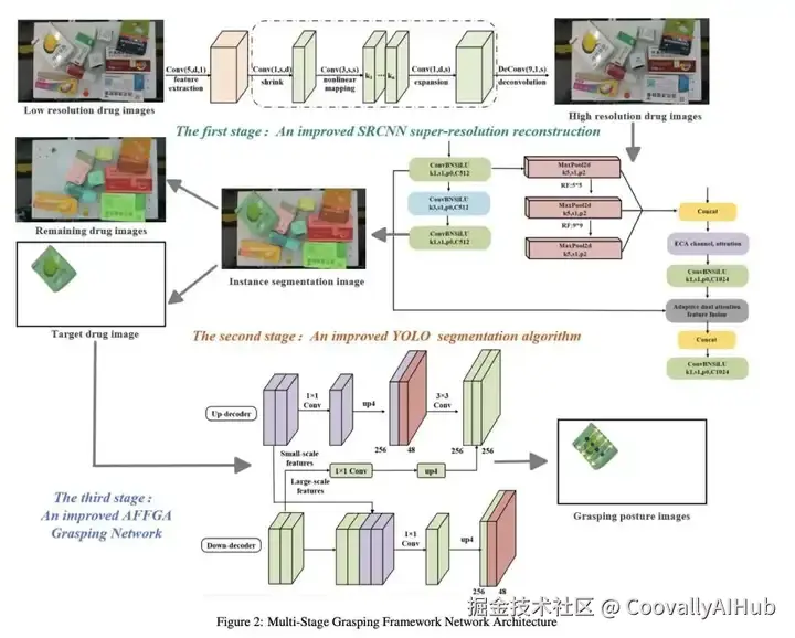 - 新型多阶段抓取框架使用改进的超分辨率卷积神经网络(SRCNN)对图像进行预处理,从而提高了图像质量和模型预测速度。预处理后的图像被输入 YOLO-EASB 实例分割算法,该算法完善了 YOLOv5 spp 和 FPN 结构,并引入了自适应的双重关注机制,以便在混沌闭塞情况下进行准确的药物分割。通过评估分割掩码的完整性来确定最佳抓取药物,IAFFGA-Net 可确保精确抓取。