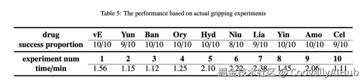 表中显示实际抓取实验中,vE、Ban、Ory、Hyd、Yin和Amo达到100%成功率,而Yun、Lia和Cel十次实验中出现一次抓取失败。此外较小圆柱体药品Niu出现两次抓取失败,说明需提升本抓取检测网络对小目标和圆柱体的性能,这仍是未来工作目标。实验室测试中为安全考虑将机械臂速度限制在250毫米/秒,十次实验中抓取十粒药品最高耗时2.38分钟,满足实时操作需求。