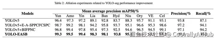 为验证模型性能,在相同环境下将基于改进YOLOv5的YOLO-EASB模型与YOLOACT(Bolya et al., 2019)、SOLOv2(Wang et al., 2020)、YOLOv7-seg(Wang et al., 2023)、YOLOv8-seg(Dumitriu et al., 2023)及Mask-RCNN(He et al., 2017)等主流实例分割算法模型进行对比,结果如表1和表2所示。可见本章方法在mAP50、精确率和召回率指标上均优于其他方法,较现有流行模型YOLOv7X-seg和YOLOv8X-seg分别获得2.7%和4%的精确率提升,以及2.9%和2.5%的召回率提升。相比经典模型Mask-RCNN,精确率提高6.7%,召回率提高7.4%。与单阶段方法YOLACT和SOLOv2相比,本章模型精确率分别高出4.3%和6.1%。这些结果表明本文YOLO-EASB模型取得了良好分割性能,但在VE等小目标药品分割上mAP仅95.8%,为模型后续改进指明了方向。
