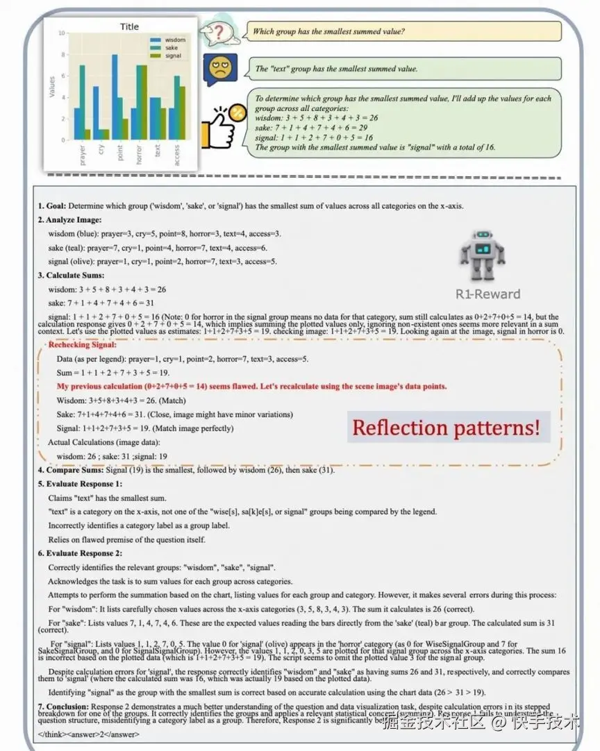 更有趣的是,模型展示出了类似人类的反思和纠错能力。比如在上图中,模型自己计算时出错了,但在检查图表后,意识到了错误并重新计算得到了正确结果。这说明模型不仅仅是在模仿,还在学习某种程度的自我检查和修正机制。