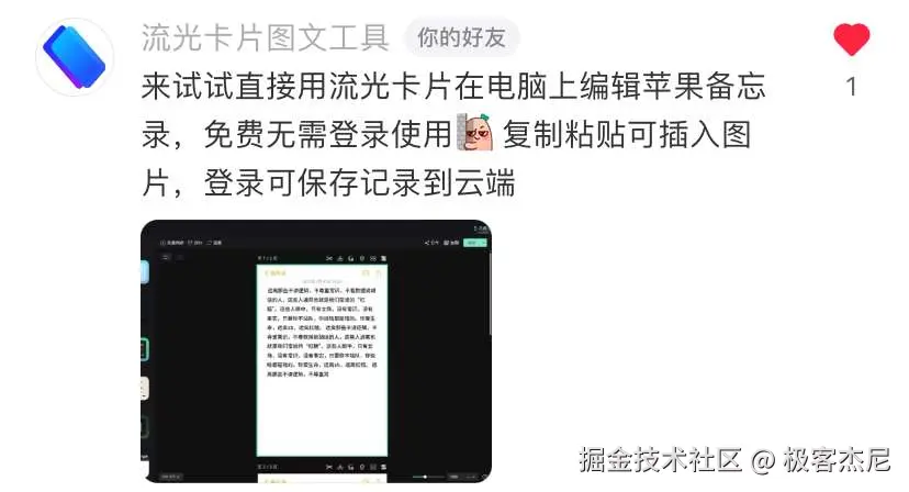 3月份偶然一次机会,小红书上流光卡片的开发者关注了我的账号,可能是因为我的笔记风格都是苹果备忘录,和他们提供的主题比较契合。