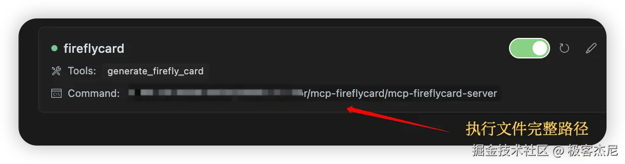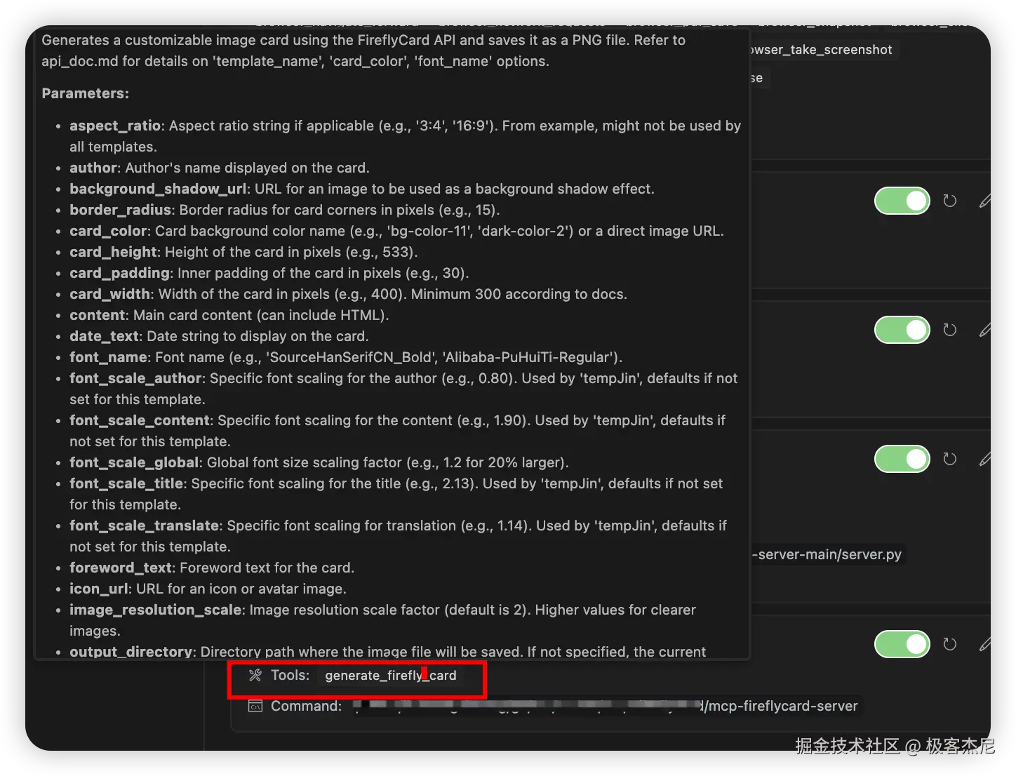 鼠标移动到 Tools 上看看, generate_firefly_card 工具被正确识别,后面在对话中可以直接 @fireflycard 制作图文卡片了。