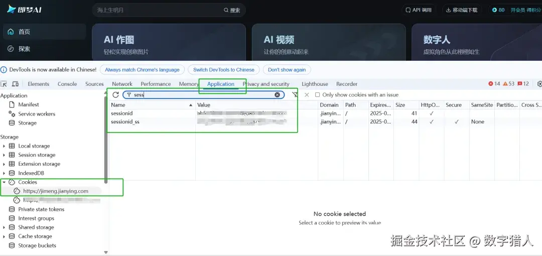 打开即梦官网 (jimeng.jianying.com/),然后登录账号,按 F12 打开“开发者工具”,