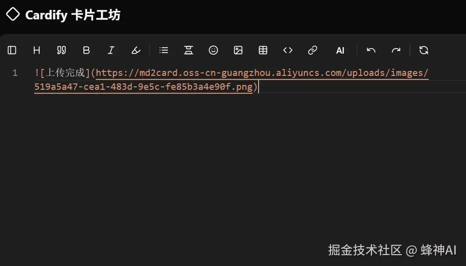 图片将自动生成 Markdown 格式并立即开始上传,同时会提示上传完成。