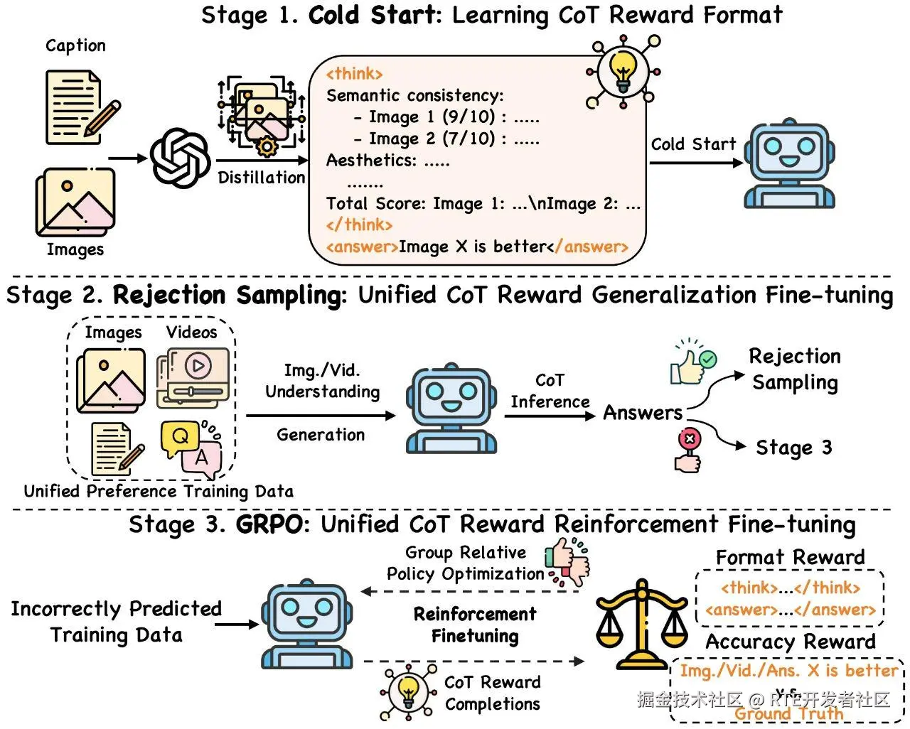 腾讯混元联合多家机构推出 UnifiedReward-Think,首次实现具备长链式推理能力的统一多模态奖励模型,通过三阶段训练(冷启动激发、拒绝采样巩固、GRPO 强化)提升评估能力。该模型解决了现有奖励模型只能「表面判断」的问题,展现出显式和隐式推理能力,在图像生成和理解任务中性能显著提升,同时保持高可解释性。