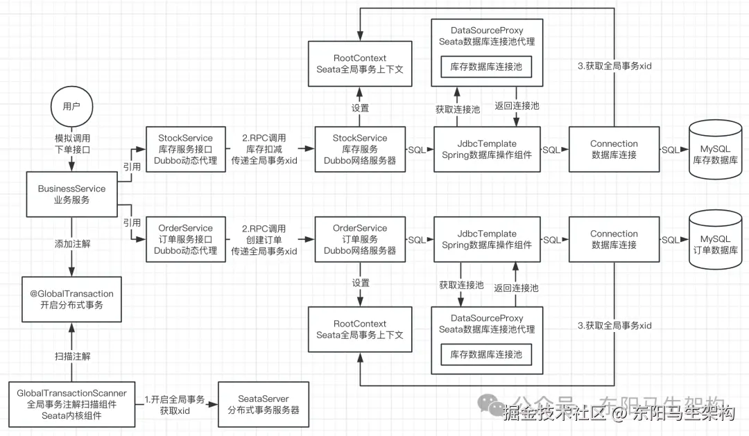 数据库连接池代理DataSourceProxy,会注入到JdbcTemplate数据库操作组件中。这样库存或者订单服务就可以通过Spring数据库操作组件JdbcTemplate,向Seata数据库连接池代理DataSourceProxy获取一个数据库连接。然后通过数据库连接,把SQL请求发送给MySQL进行处理。