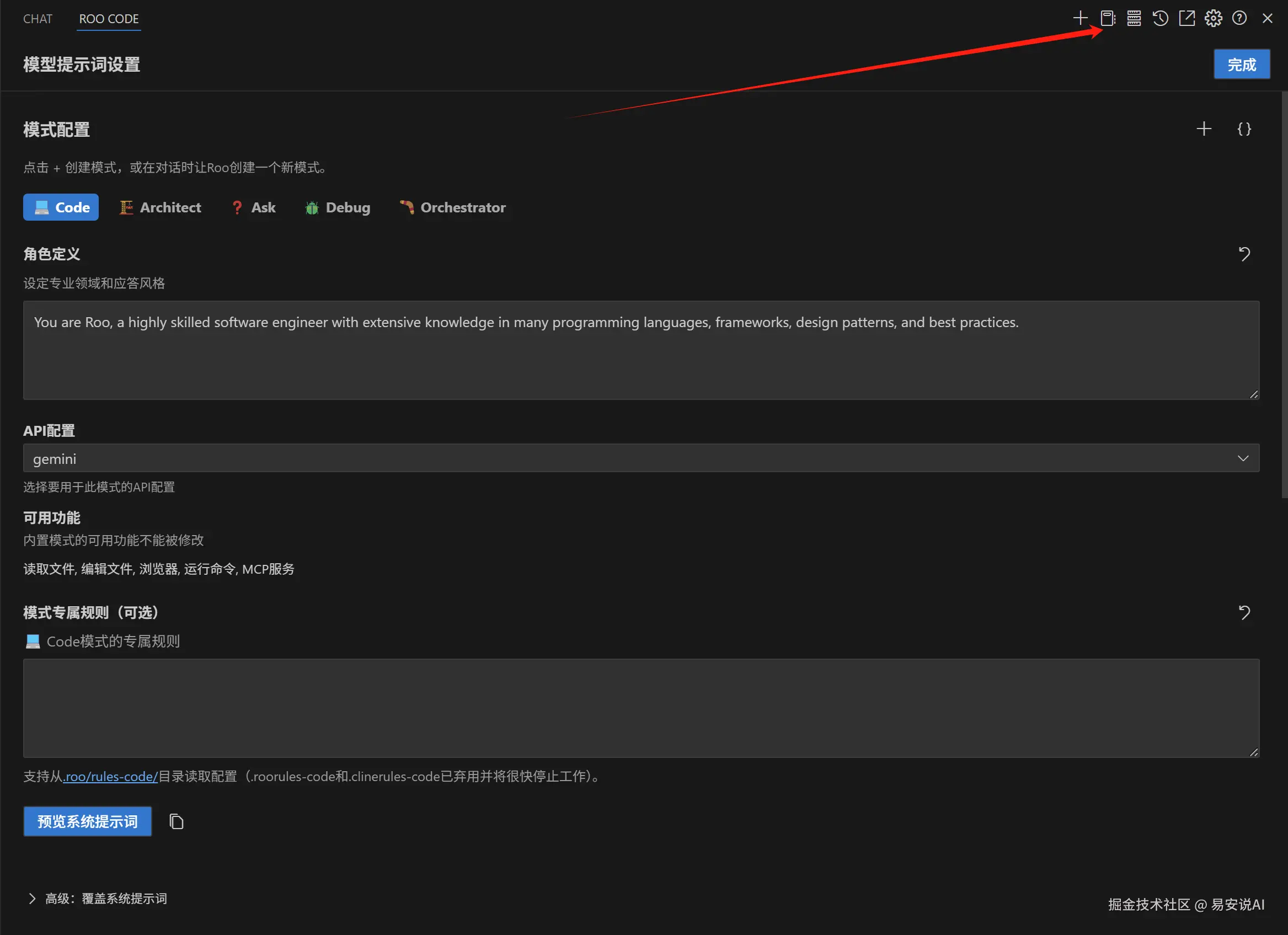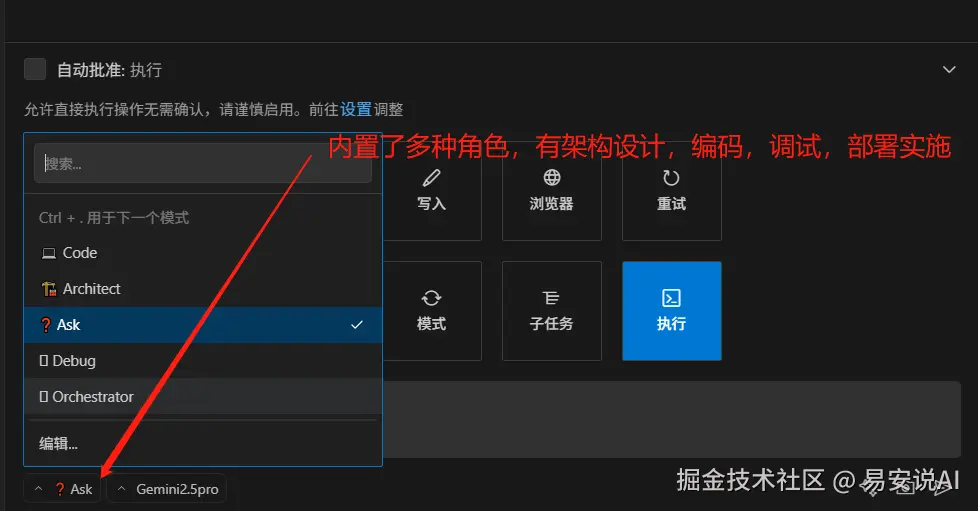 roo code 内置了架构师、编码、调试、实施、问答,等多种角色,都提供不同的功能、专业知识和访问级别,意味着你可以给不同的模式绑定不同的API配置,举个例子架构师这个模式选择用gemini2.5pro模型,code模式选择用claude 3.7模型,每个内置的AI助手可以高度定制化,更加灵活,如果你是新手,建议保持默认即可。