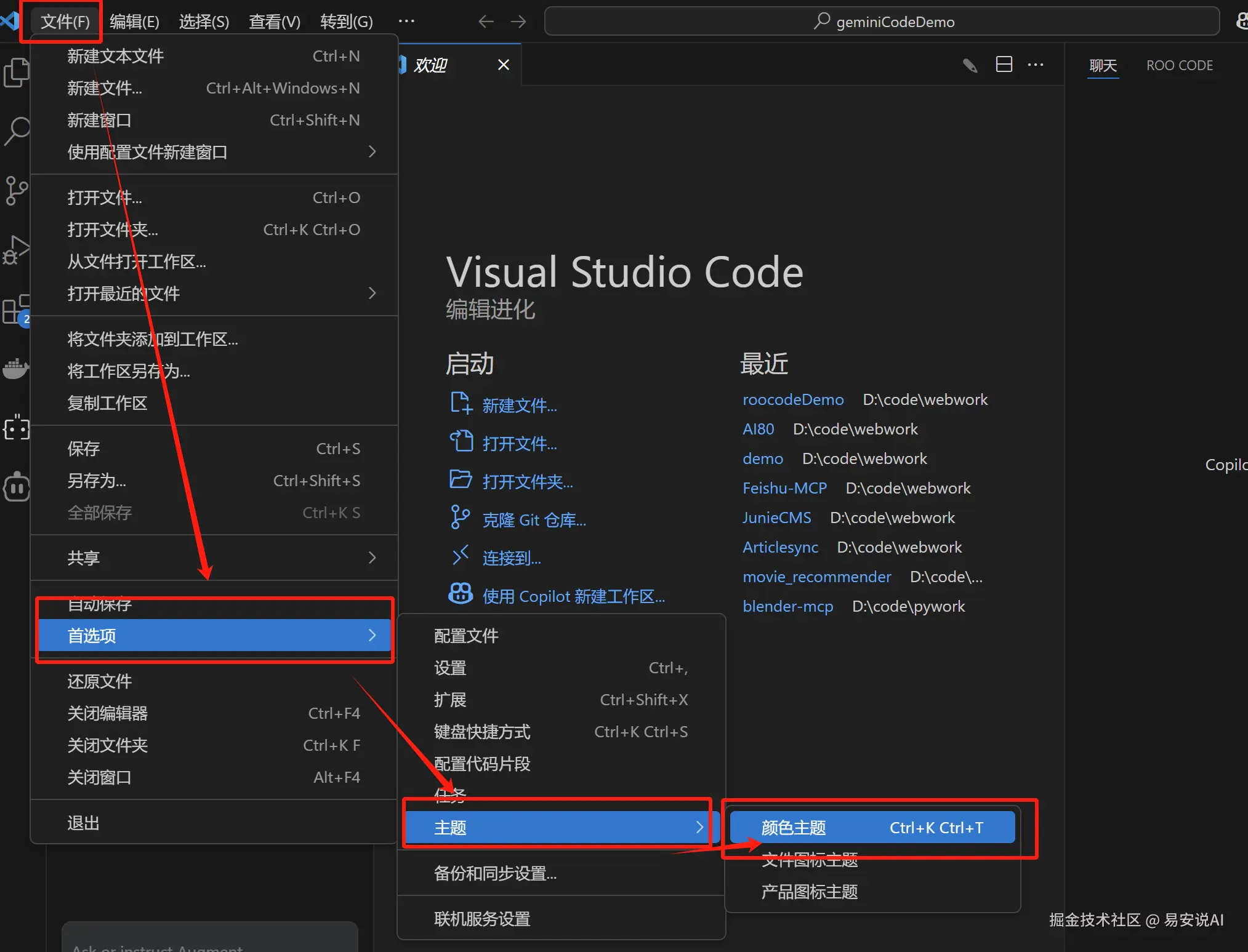 - 设置主题:VS Code提供了多种主题供选择,您可以根据自己的喜好选择亮色或暗色主题。选择"文件" > “首选项” > “颜色主题”,然后从列表中选择一个主题,如下图所示: