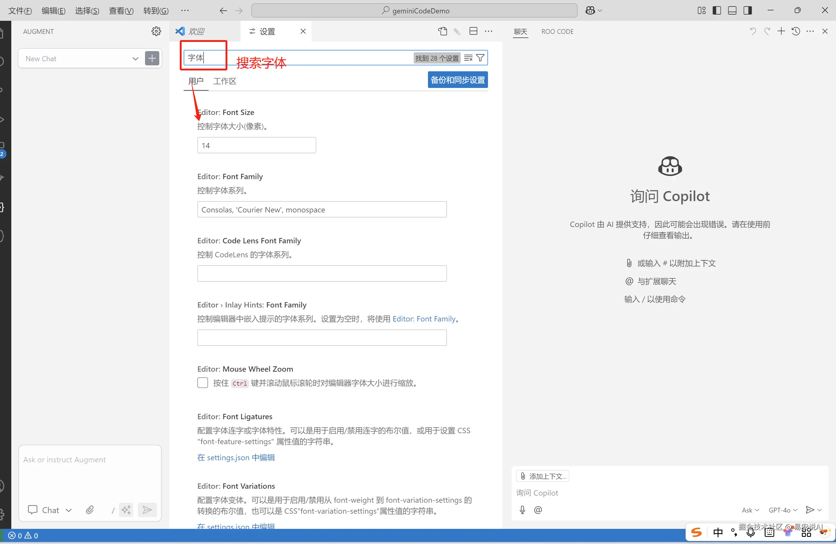 - 设置字体大小:为了提高代码阅读的舒适度,您可以调整编辑器中的字体大小。这可以通过菜单栏的"文件" > “首选项” > “设置”,然后搜索"字体"来完成。
