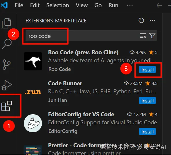 首先,在左侧找到扩展图标并点击,然后在搜索框中输入Roo Code。等待加载完成后,点击install。