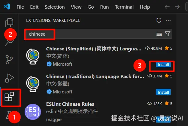 点击插件按钮,搜索框输入 chinese ,点击 install