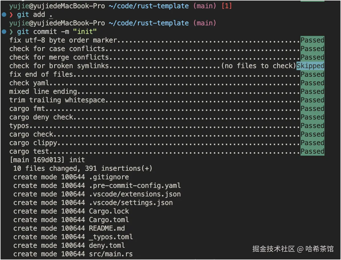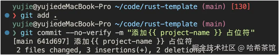 大功告成,提交试试,这时Git hooks肯定会给我们报错,因为Cargo.toml使用了不规范的项目名称,因为这是模版项目,所以我们可以添加--no-verify参数来提交,暂时跳过Git hooks检查: