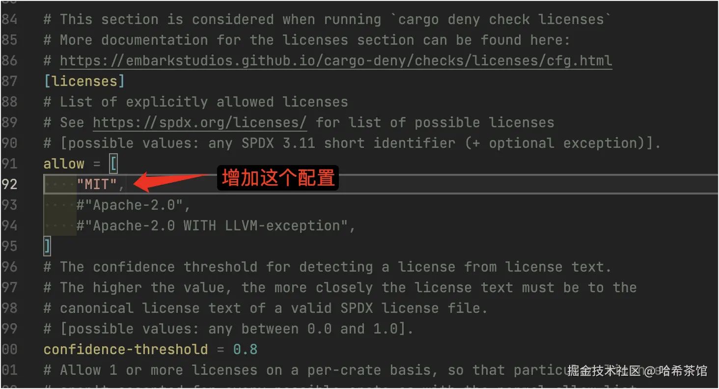 这是警告你deny.toml文件内没有配置当前项目允许MIT协议,打开deny.toml文件按照如图配置: