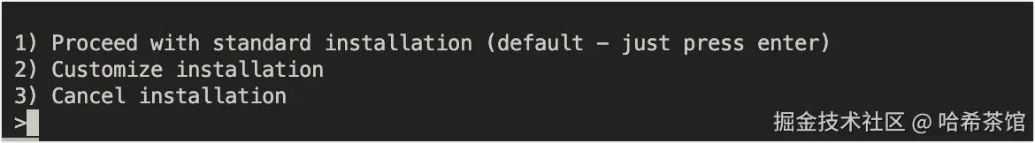 下载过程我就不截图了,下载完成后会让你选择安装标准版还是自定义安装,直接回车或者选择1就行了。windows的同学可以直接下载官网的安装包进行安装