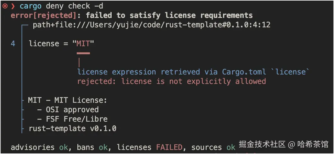 安装完成后运行cargo-deny init会在根目录下生成默认的deny.toml配置文件,然后需要运行cargo deny fetch获取初始化cargo-deny的数据库,初始化完成后,让我们增加一个MIT协议试试cargo-deny是否可用。