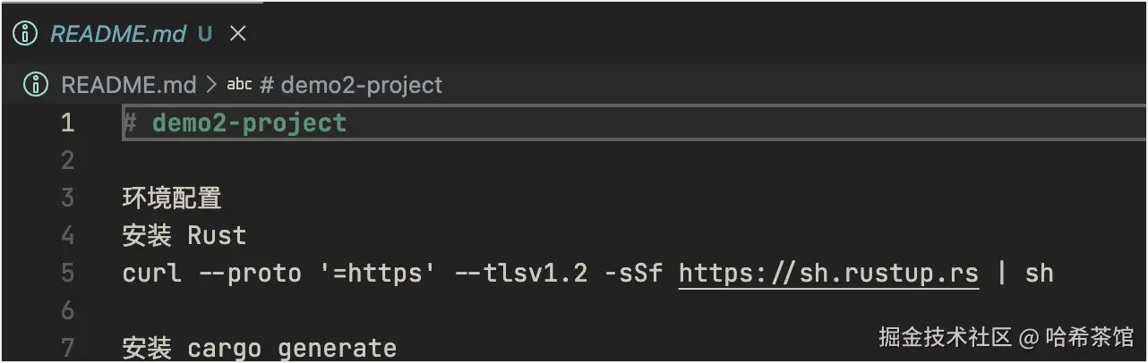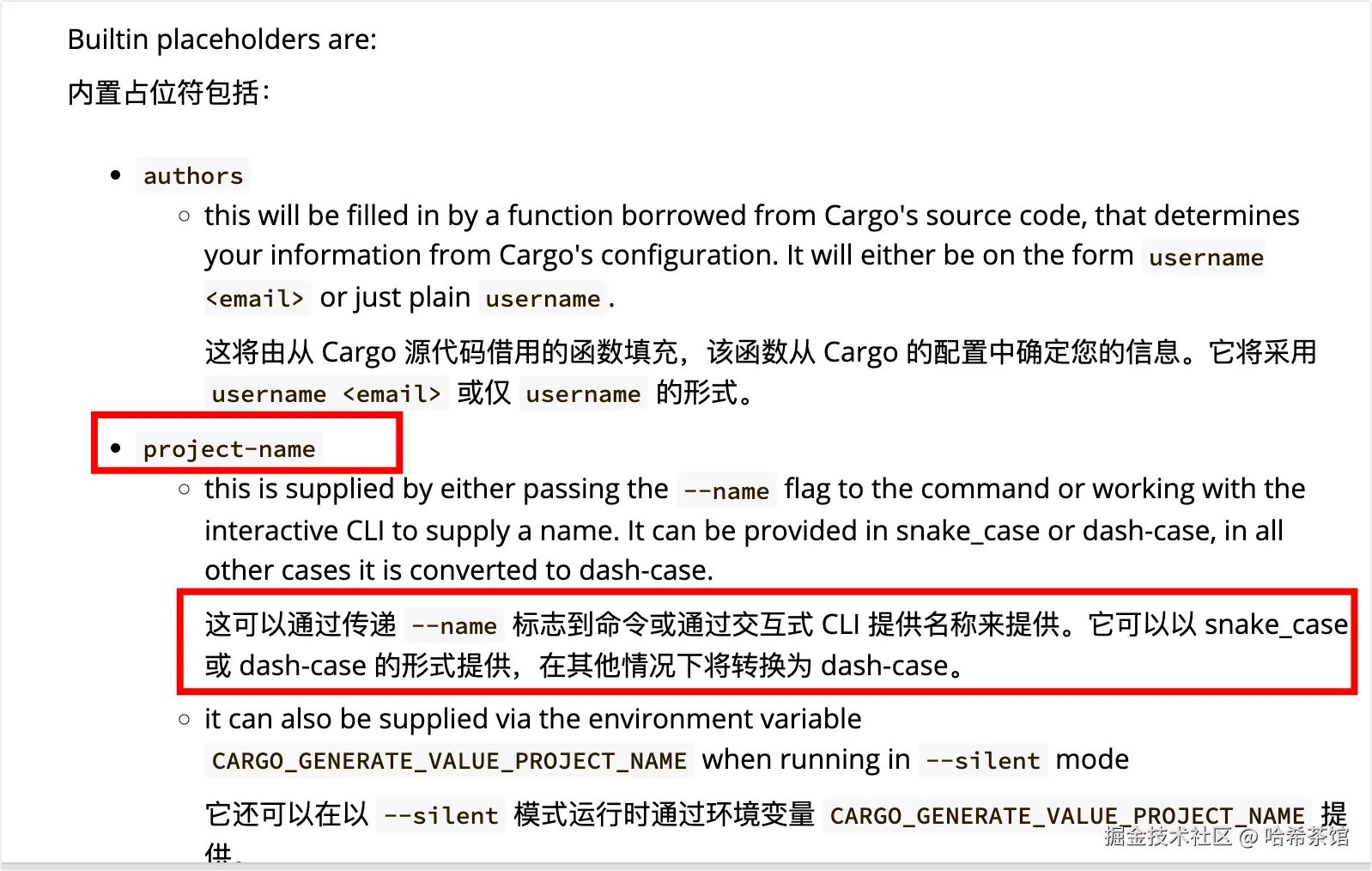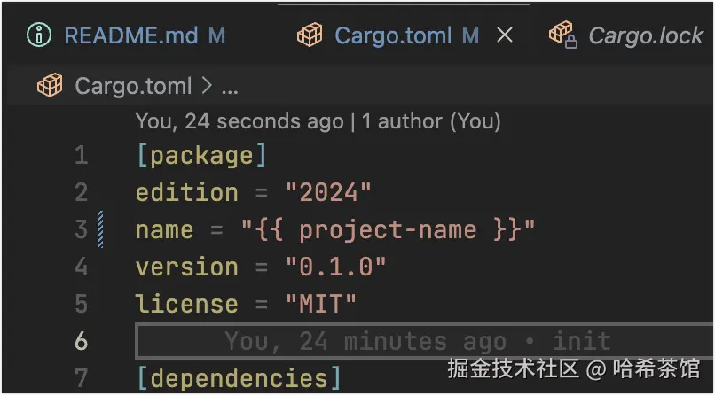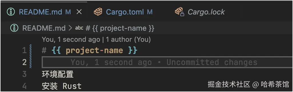 原来可以用占位符{{ project-name }},然后我们的项目名称可以自动填充上去,现在就试试看,将README.md、Cargo.toml中的项目名称部分换成{{ project-name }}
