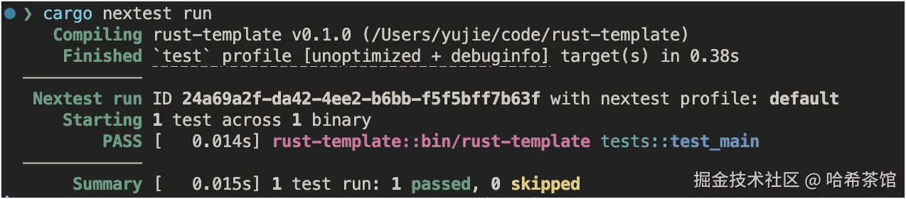 运行cargo nextest run,如果输出如下结果就说明安装成功了: