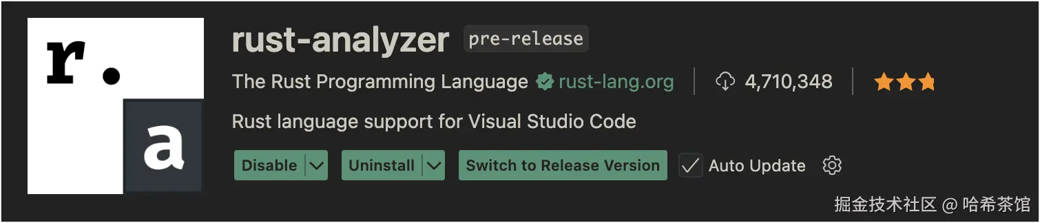 下面就得请出宇宙级IDE Visual Studio Code 来帮助我们完成后续的任务了,如果你是以为前端开发者,对这个肯定不陌生,我就不啰嗦了,赶紧装上rust-analyzer (Identifier: rust-lang.rust-analyzer) 开始我们后续的学习吧!