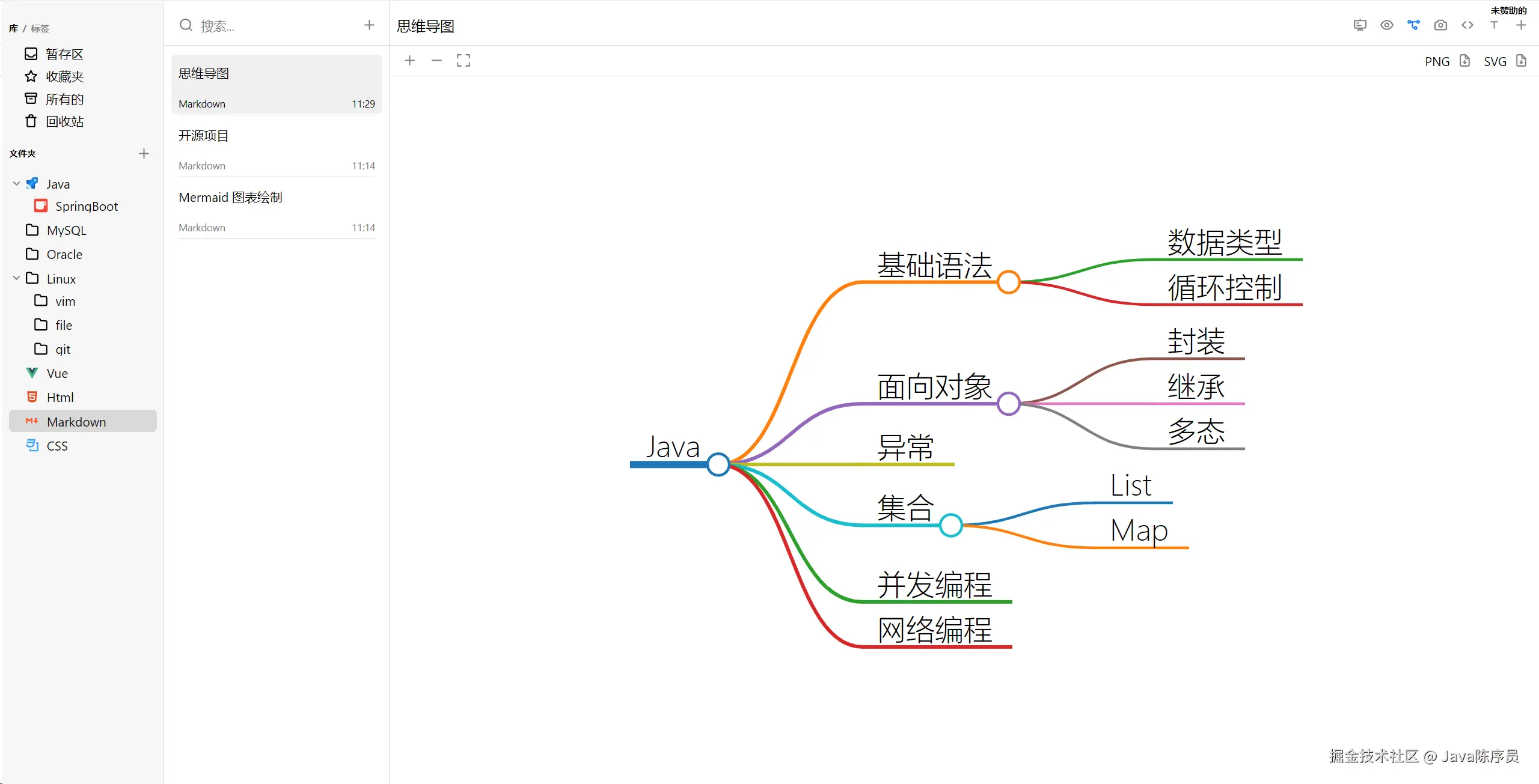 - 支持 Markdown 语法编写,提供语法高亮、表格、列表等格式化功能,还支持 Markdown 文本转思维导图以及 Mermaid 图表绘制