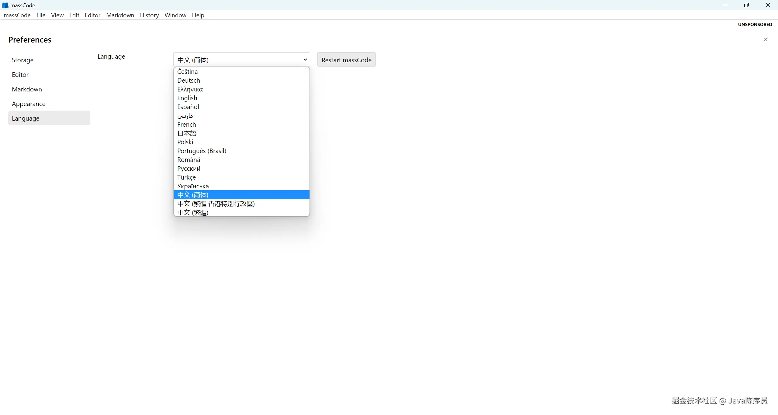 4、massCode 默认语言是英语,首次打开后,使用快捷键 ctrl + , 打开设置页面调整为中文