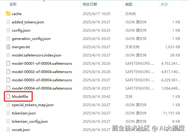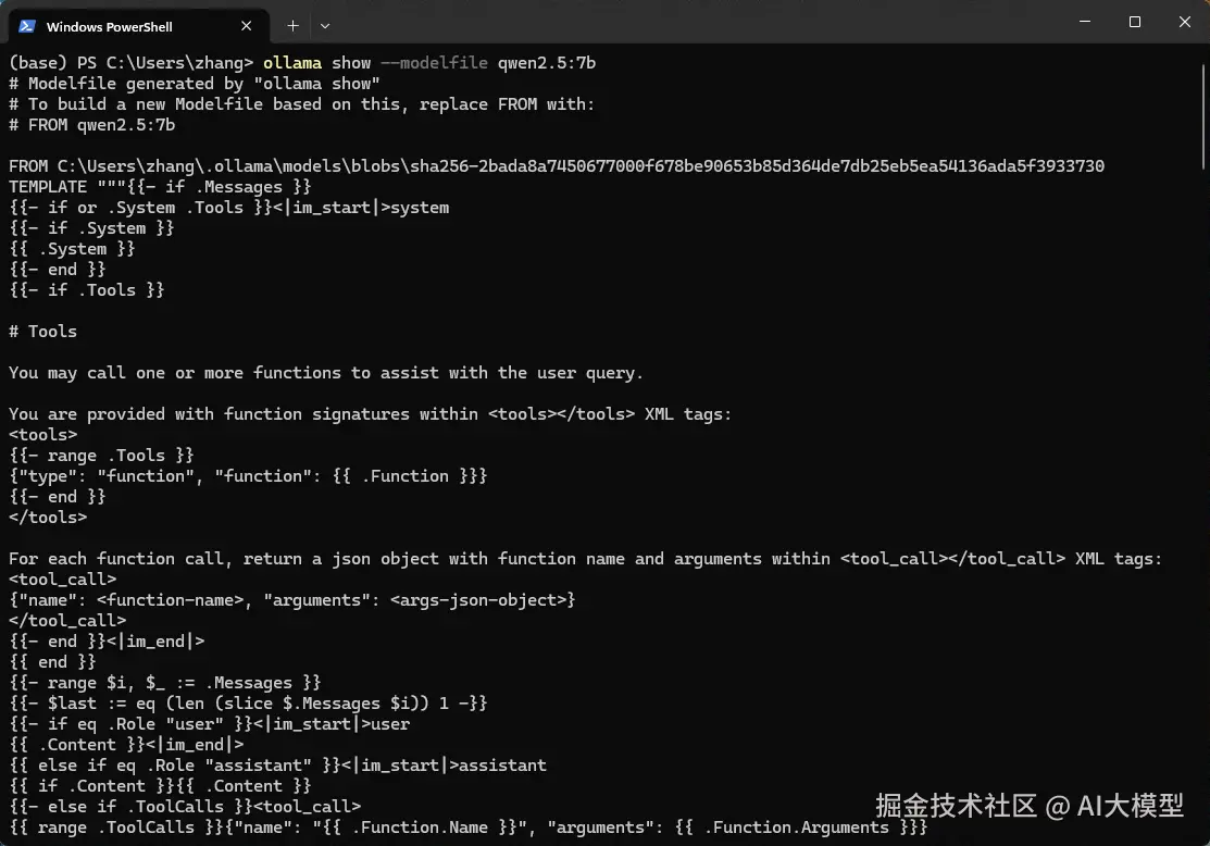 新版的 Ollama 可以直接导入 safetensors 模型,首先需要准备 Modelfile 文件。Modelfile 文件是一个文本文件,包含了模型的基本信息和配置参数。可以在命令行中执行下面的命令,看看 Ollama 中对应的模型是怎么写的。