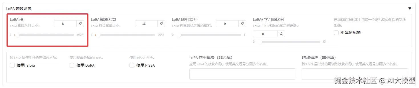 接着对 LoRA 参数进行设置。其中关键的参数是秩(rank) ,秩的大小直接影响模型的性能和资源消耗。秩越大,引入的可训练参数越多,模型对新数据的适应能力越强,但也增加了计算和内存的需求,可能导致过拟合。秩越小,引入的可训练参数较少,减少了计算和内存的需求,但可能不足以充分适应新数据,影响模型性能。可以从较小的值开始(如8、10、12),逐步增加,观察模型性能的变化。