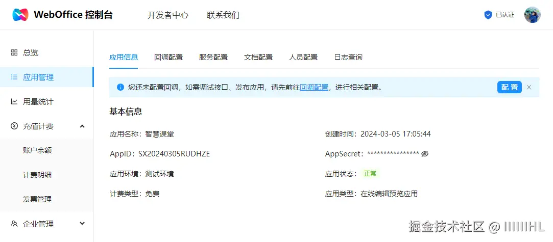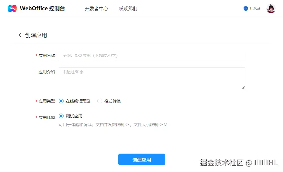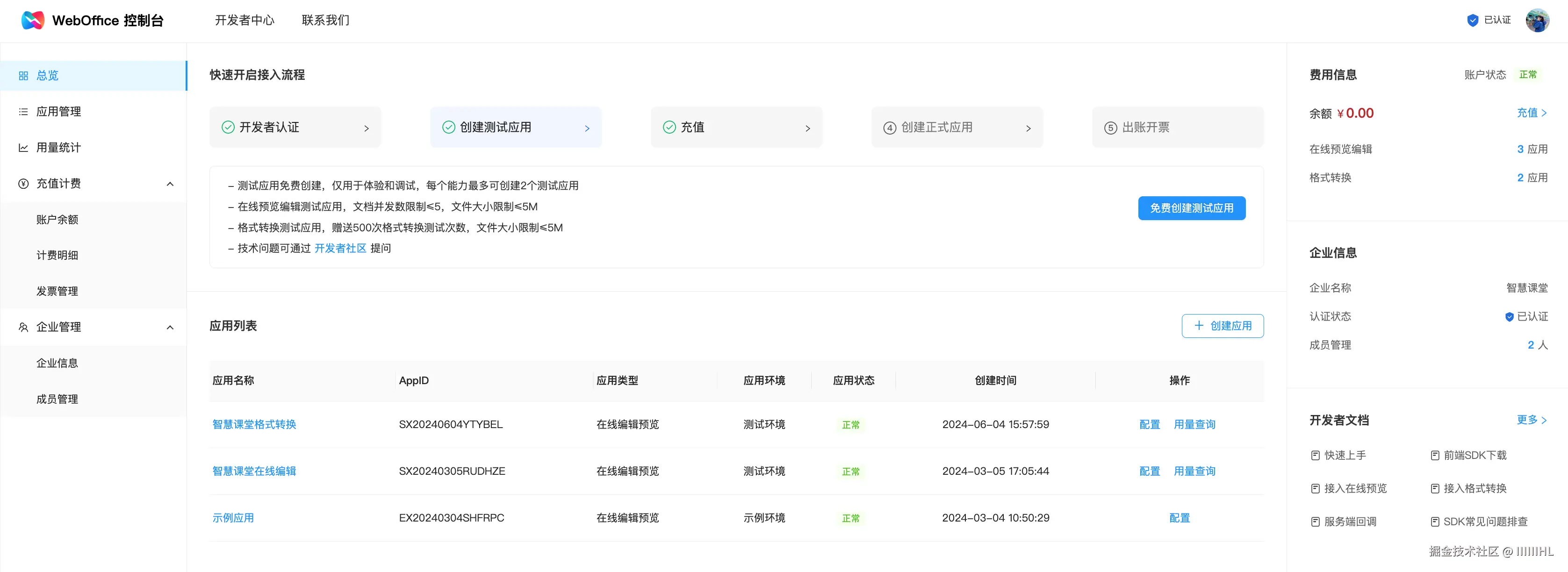 完成开发者认证后即可免费创建应用,用于体验和调试 WebOffice 在线预览编辑和格式转换能力,每个能力最多可创建 2 个测试应用