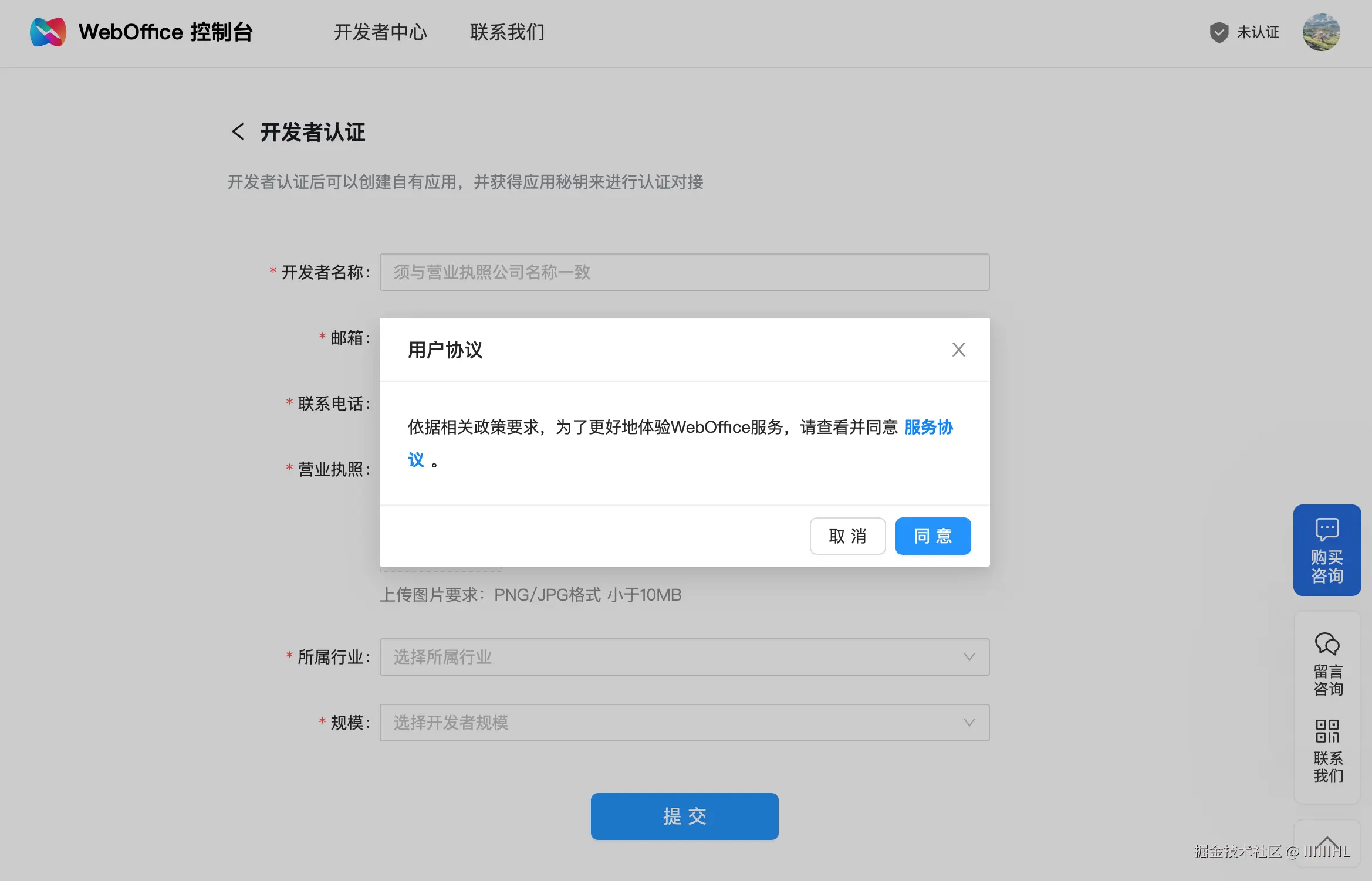 点击 【开发者认证】 进入认证流程,在认证之前请先仔细阅读 服务协议,点击 【同意】 后进入下一步操作。
