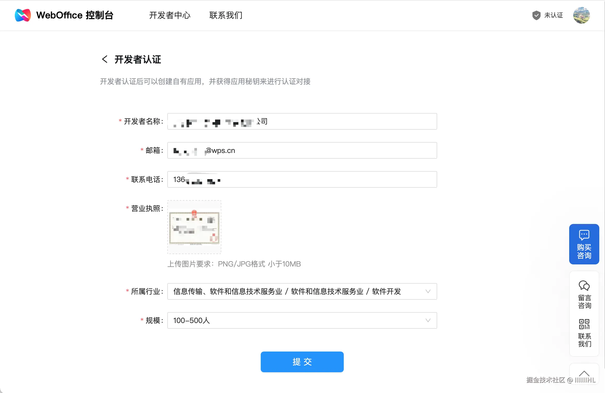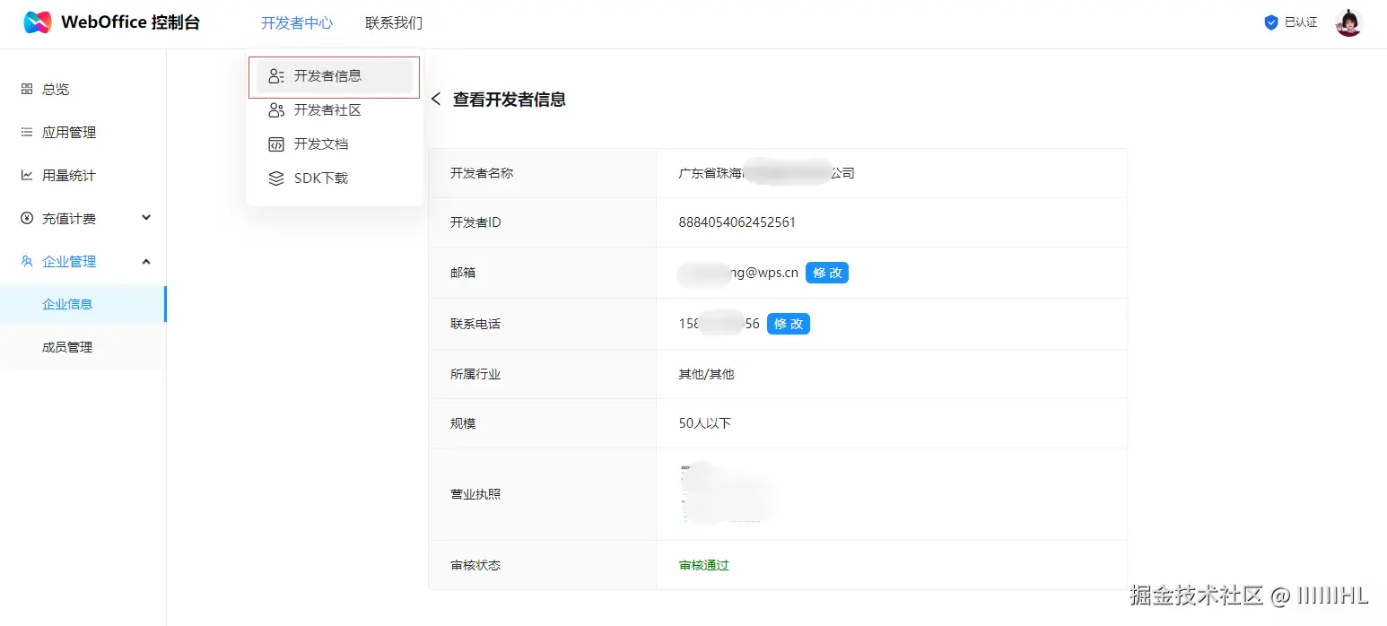 填写开发者信息,您需要根据字段提示如实填写您所在企业的信息,并需要上传一张符合要求的营业执照。