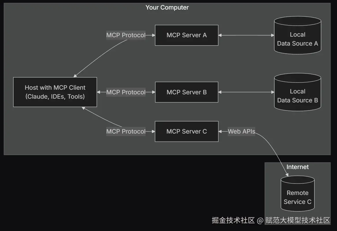不同于Function calling技术,MCP技术是对于大模型和外部工具的另一种划分方式,也就是说在MCP技术体系中,此时MCP会将外部工具运行脚本称作服务器,而接入这些外部工具的大模型运行环境称作客户端。