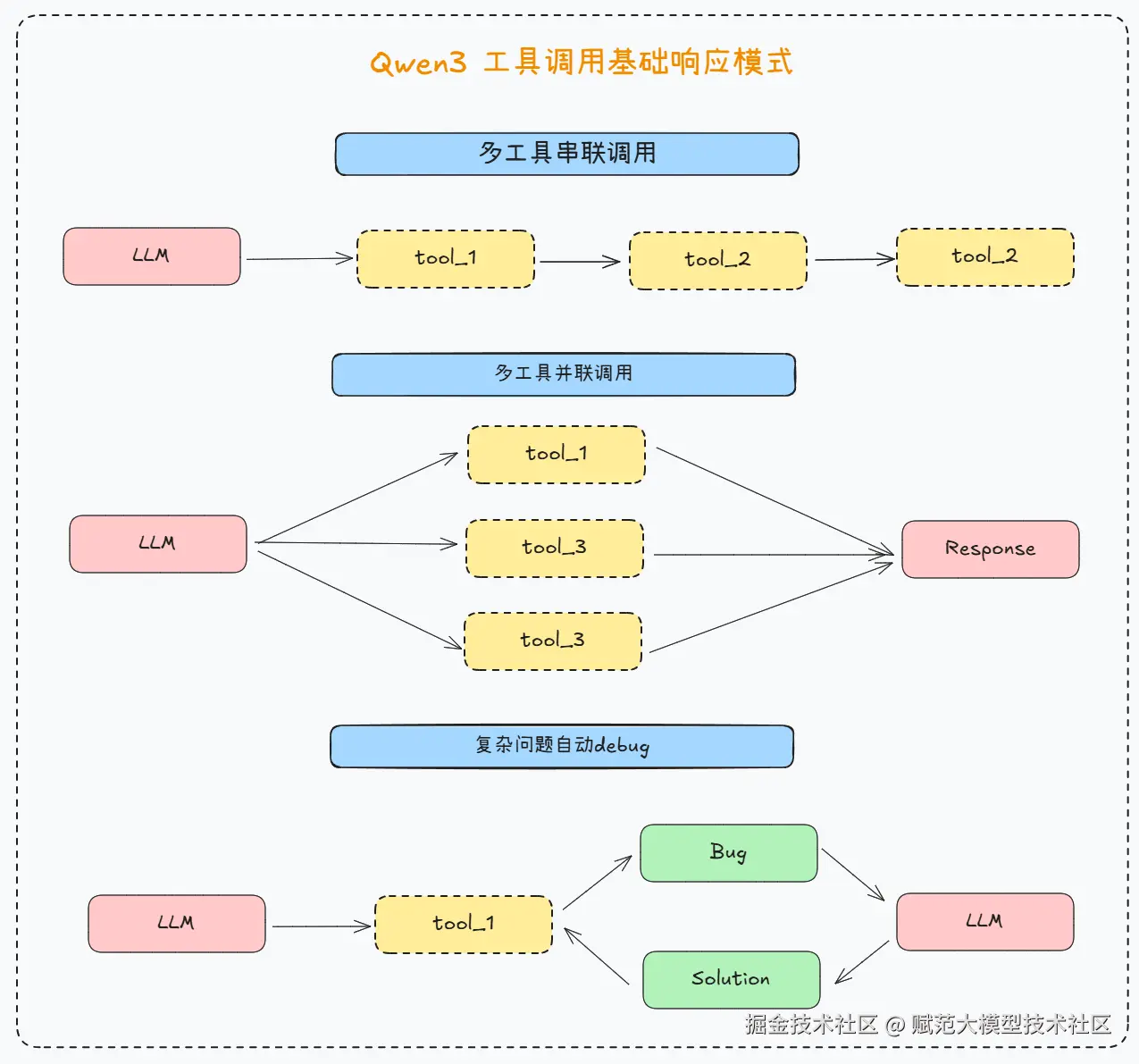 而对于Qwen3全系列模型来说,不仅支持Function calling,还支持工具的并联、串联调用甚至是自动debug: