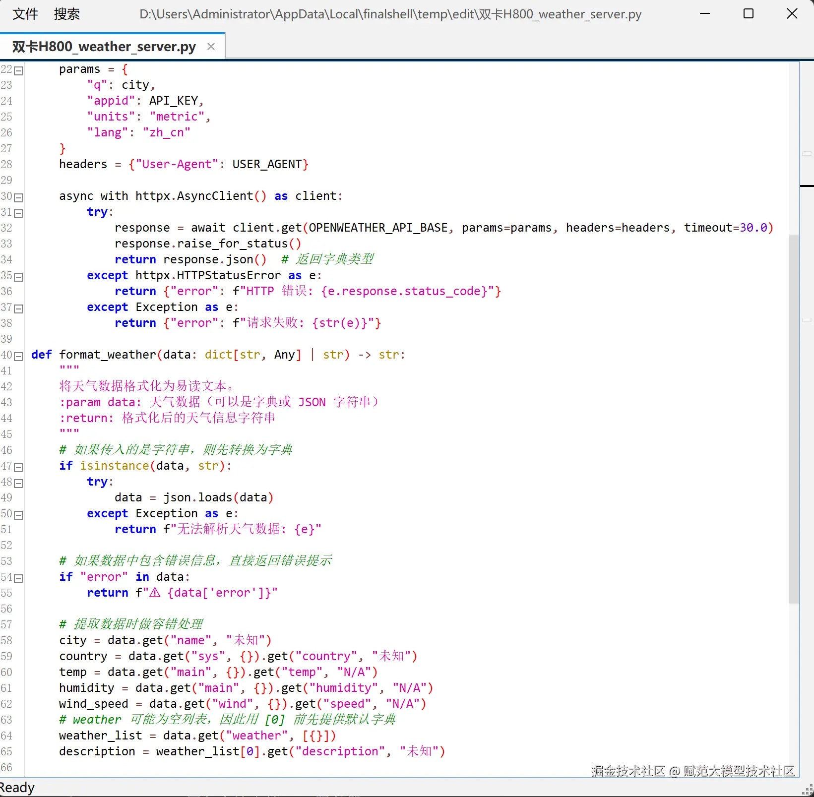 在上述示例中,我们不难发现,一个MCP服务器标准接入流程是通过写入一个配置文件来完成的。而在支持MCP功能的客户端(如Cherry Studio)中写入MCP工具的配置,其本质就是先将指定的MCP工具下载到本地,然后在有需要的时候对其进行调用。例如高德MCP配置文件如下:
