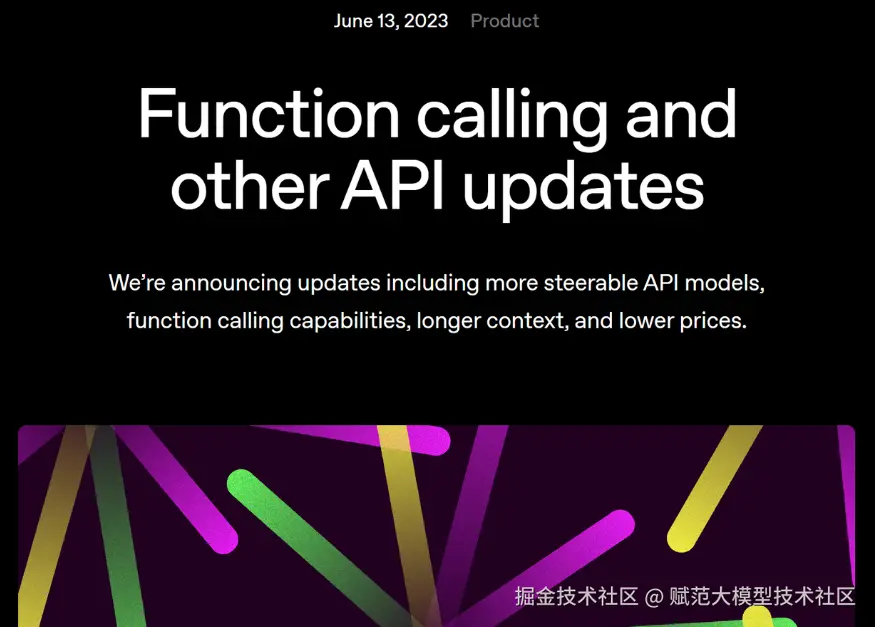 Function calling最早由OpenAI与2023年6月13号正式提出,该项技术的名字也由此命名:openai.com/index/funct…