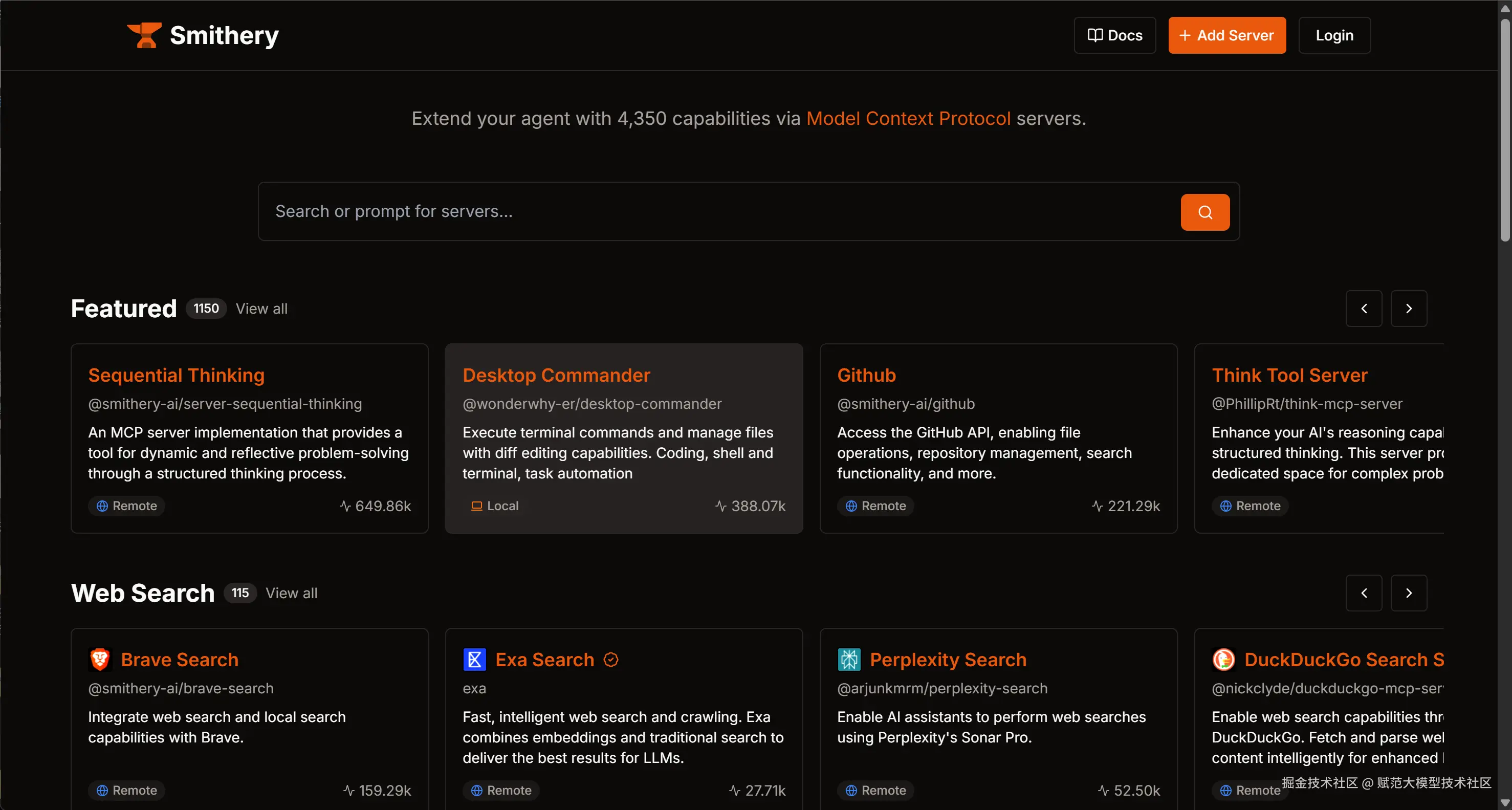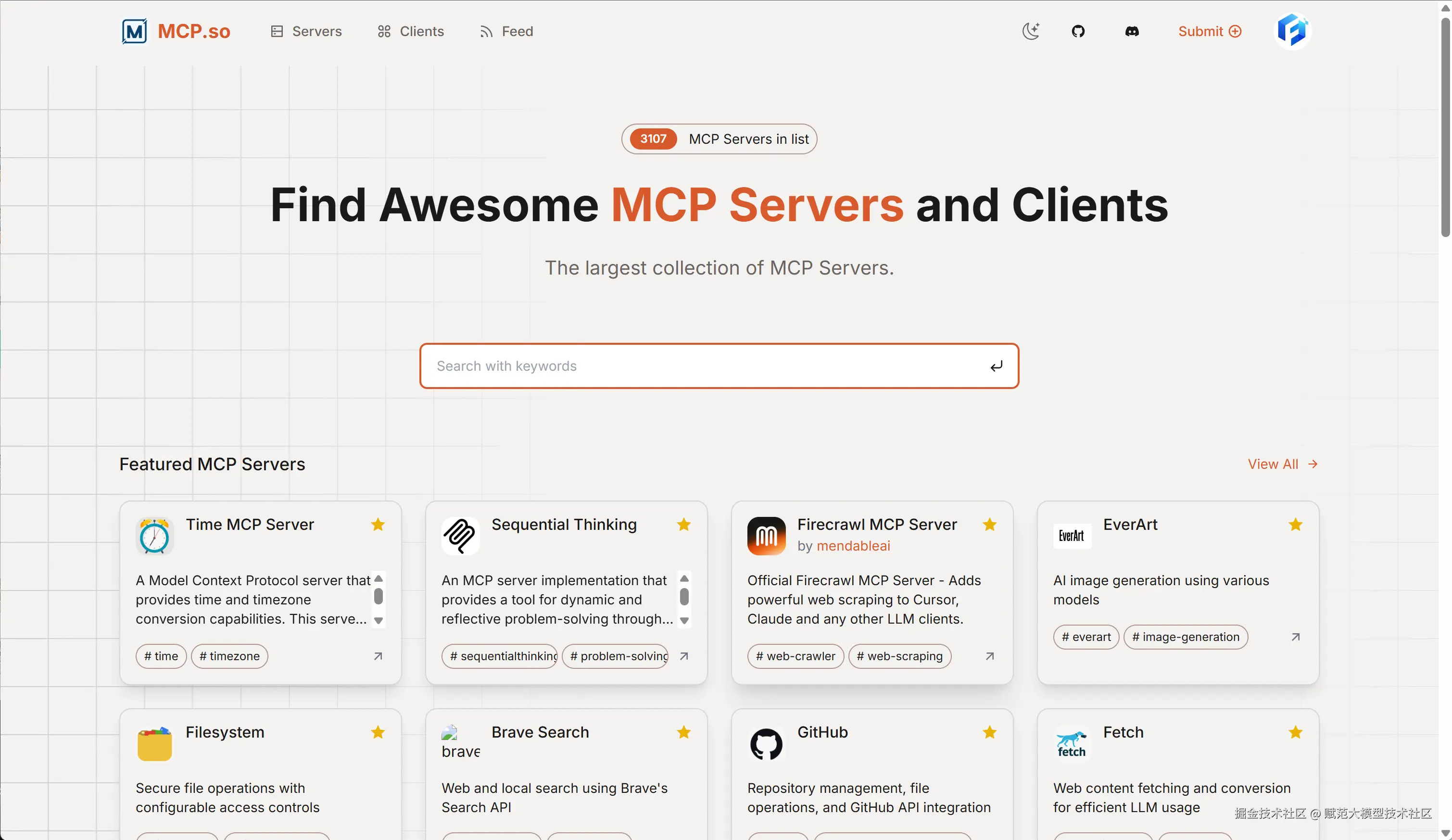 暂时抛开底层原理不谈,在MCP技术爆发的这几个月,市面上已经诞生了成百上千的MCP服务器,甚至还出现了大量的MCP服务器集合网站: