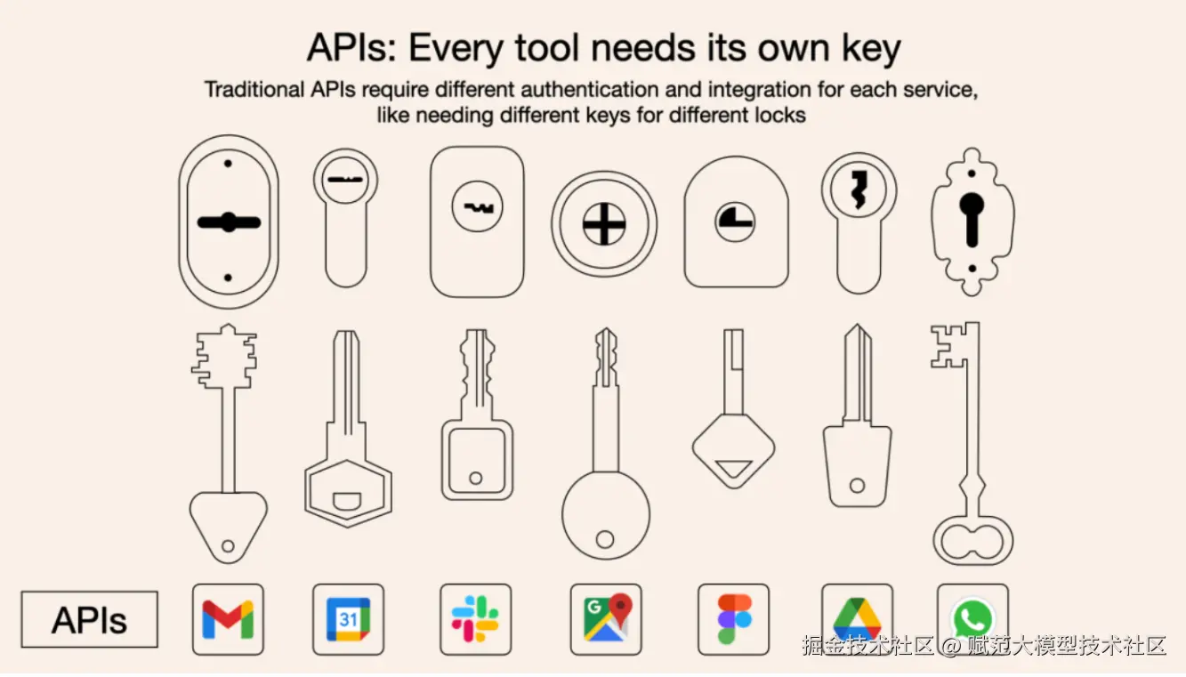 而近一段时间大火的MCP技术,其实就可以将其理解为Function calling技术的更高层封装和实现。传统的Function calling技术要求围绕不同的外部工具API单独创建一个外部函数,类似一把锁单独配一把钥匙,而一个智能体又往往涉及到多个外部工具设计,因此开发工作量很大。